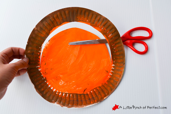 1. Paint the center of the paper plate orange. Paint the outside rim of the paper plate brown on the back and front side of the paper plate.